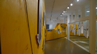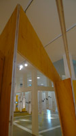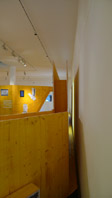 A spatial construct is positioned within changing distance to both walls and floor. As a sculptural double faced strip the wall swirls about the existant columns and forms 3 cabinets.